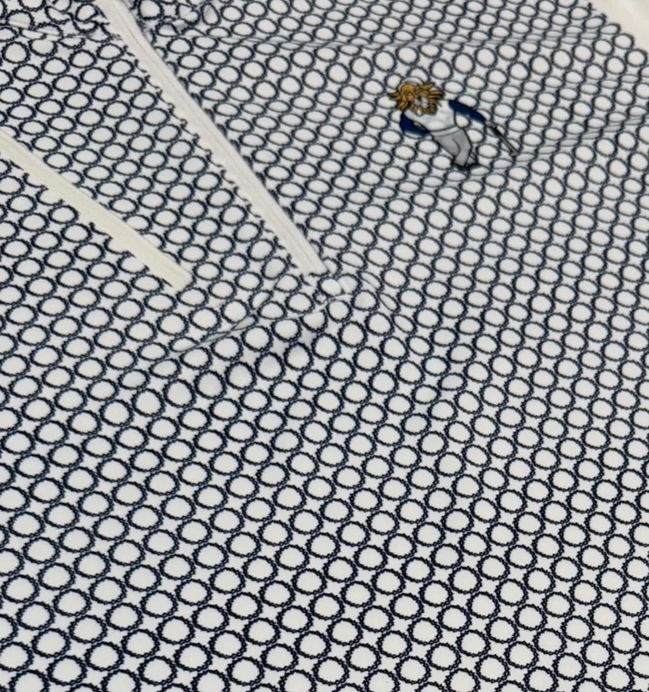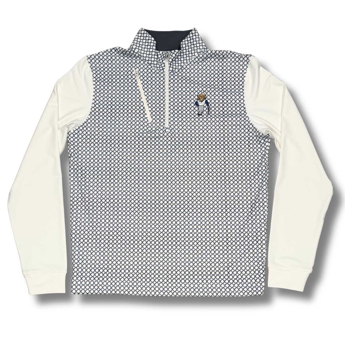 Four way stretch poly/spandex blend off white 1/4 zip pill over with chest pocket printed with our Crown of Thorns logo monogrammed over the chest, back, and torso with our King of the Green logo on the left chest. Allow 7-14 days for shipping.